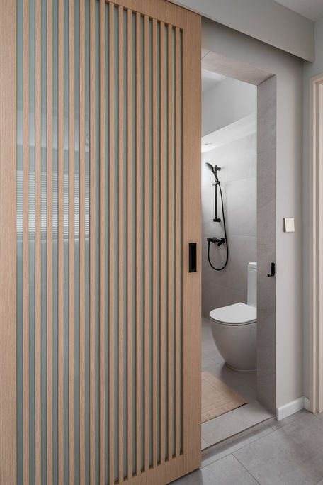 An unconventional bathroom reimagined with a sliding entry, a reoriented wash basin, and a feature wall that balances openness with function.
