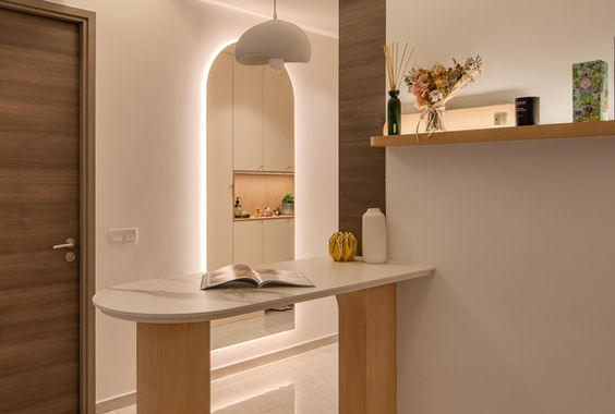 Soft lighting filters through arched frames and gently grazes the bar table, casting a warm glow that enhances the home’s overall sense of calm and harmony.