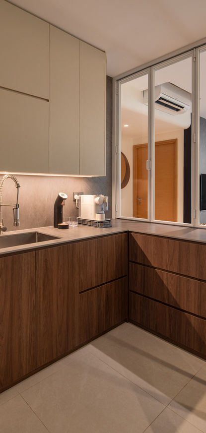 The kitchen prioritises functionality, with bi-fold sliding window paired with a full sliding panel that enhance openness and visual continuity.