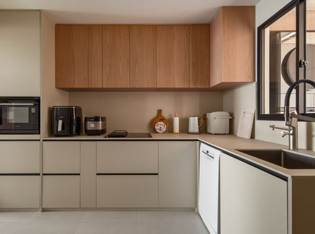 The kitchen, where natural wood tones and a soft beige base create a warm, airy space that feels both expansive and inviting.