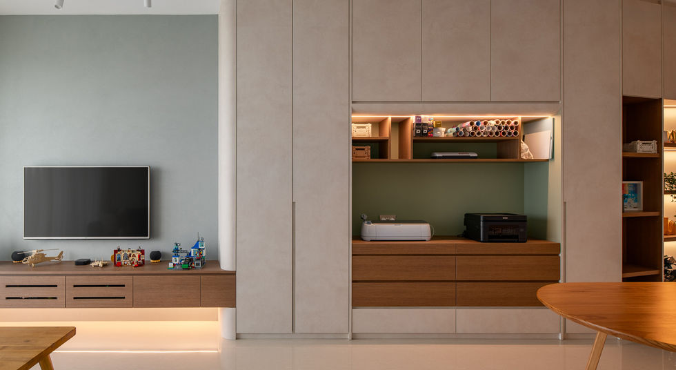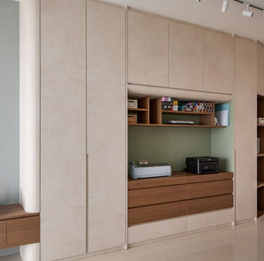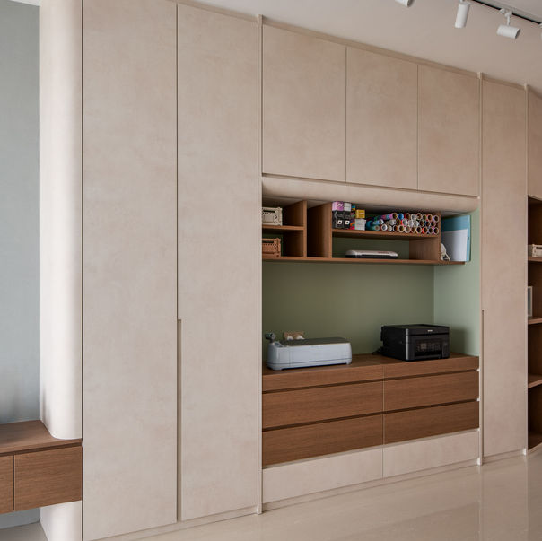 Concealed workstation seamlessly integrated into the storage wall, featuring curated pull-out drawers for effortless functionality.